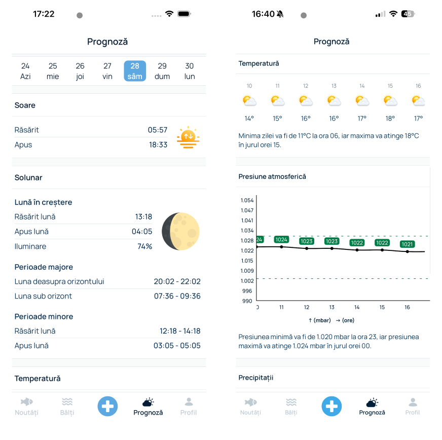 Aplicația îți oferă informații esențiale precum influența lunii, presiunea atmosferică, temperatura, vântul și precipitațiile — toate într-un singur loc.